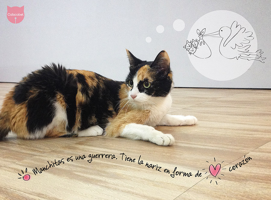 Contra todo pronóstico, Manchitas «saco sus garritas» y, en cuestión de unos pocos días empezó a caminar. Su nariz empezó a tomar un color rosado (como un corazón) y empezó a mostrar señales de mejoría. Ahora tiene una cirugía en el fémur izquierdo, posiblemente pierda la patica delantera y está embarazada de 3 gatitos.