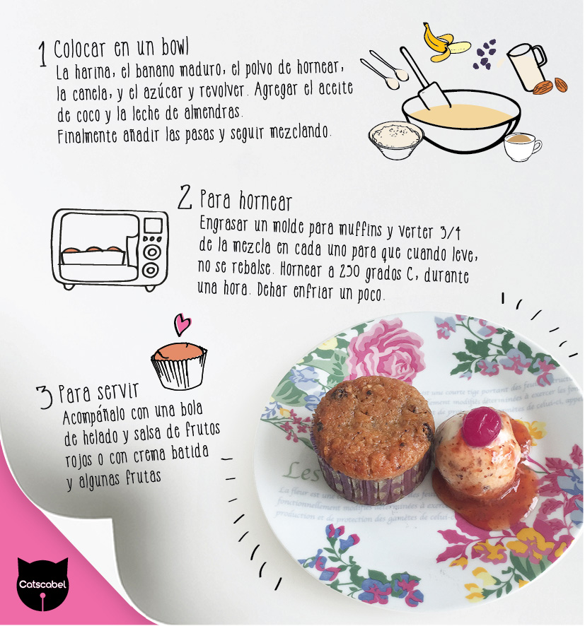 Ingredientes: 1 taza de harina, 1 banano bien maduro triturado, 2 chdtas. de polvo de hornear, 1/2 taza de azúcar rubia, 2 chdas, de aceite de coco, 1 puñado de pasas picadas, 1/2 taza de leche de almendras, 1/2 chdta. de canela. Mantequilla y ahrina para engrasar el molde.
