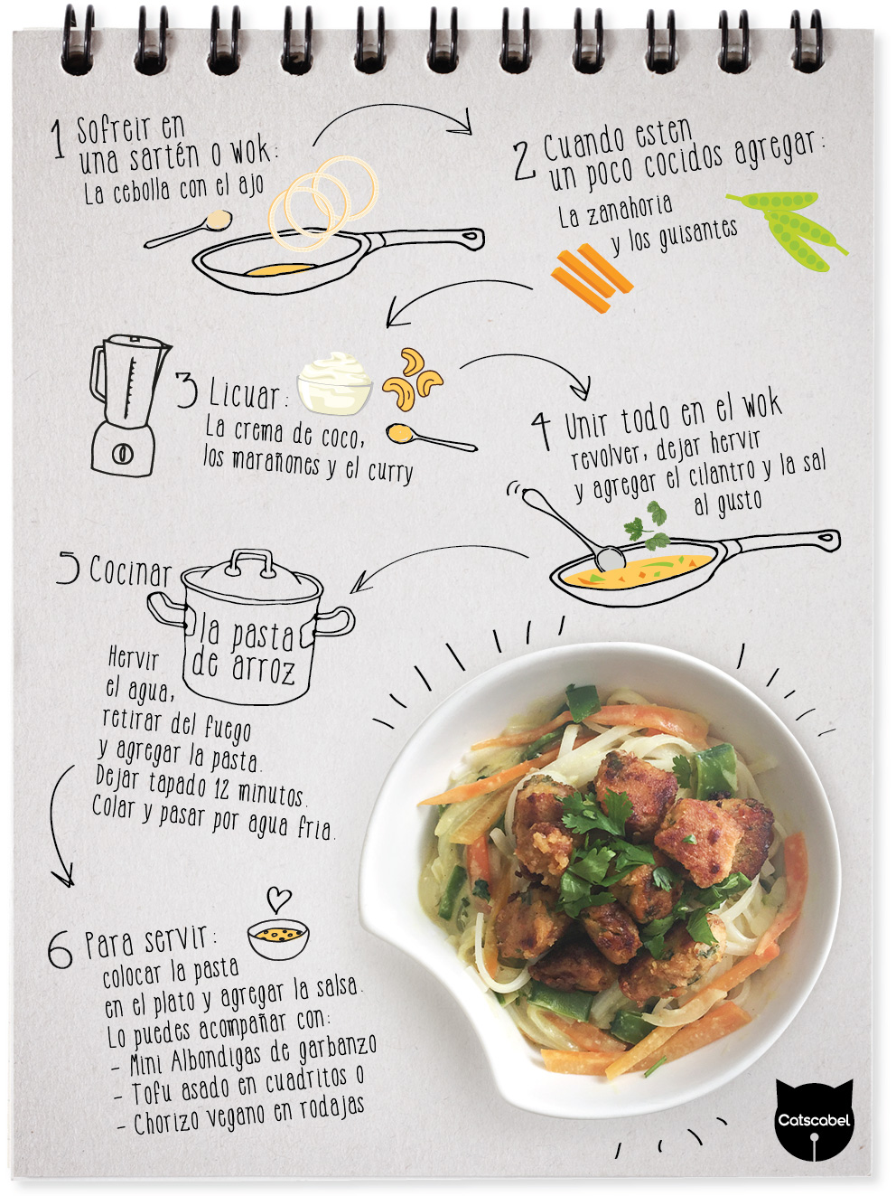 Ingredientes: 4 porciones de pasta plana de arroz, 1 1/2 tazas de crema de coco, 1 cucharada de curry amarillo en polvo, 1 cucharadita de ajo en pasta, 1/2 taza de marañones, 2 cebollas medianas cortadas en rodajas, 2 zanahorias medianas cortadas en julianas, un puñado de guisantes cortados en trocitos o enteros, mantequilla para sofreír, cilantro y sal al gusto.